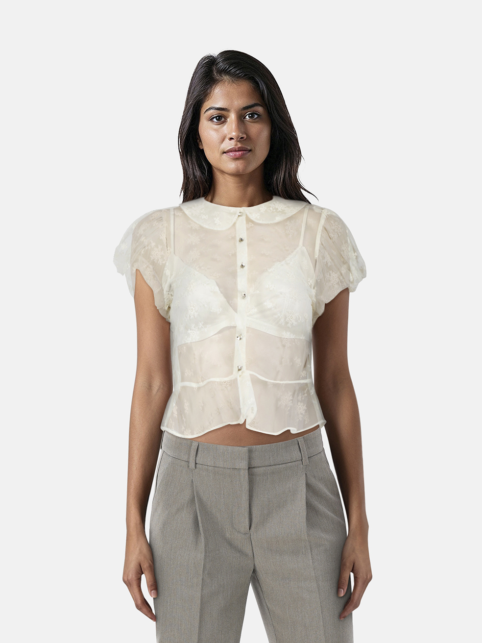 D�EN White Lace Sheer Short Sleeve Top