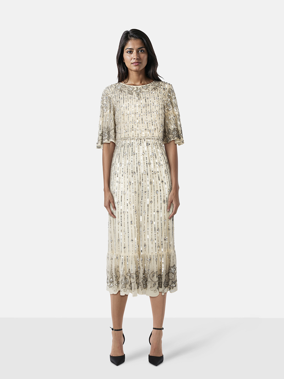 Mac Duggal Silver Embellished Midi Dress