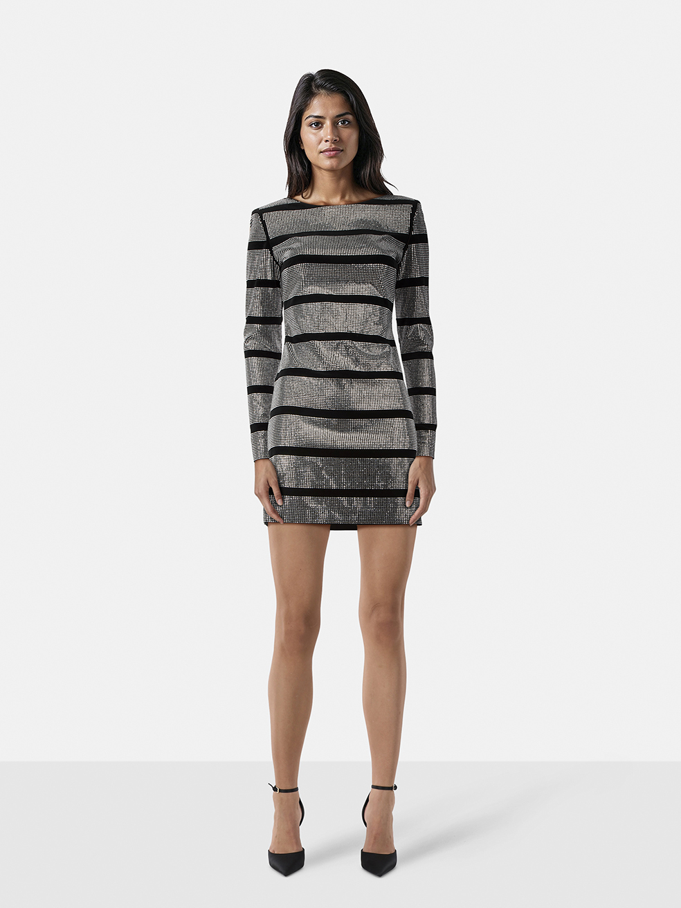 Balmain Silver Rhinestone Striped Mini Dress