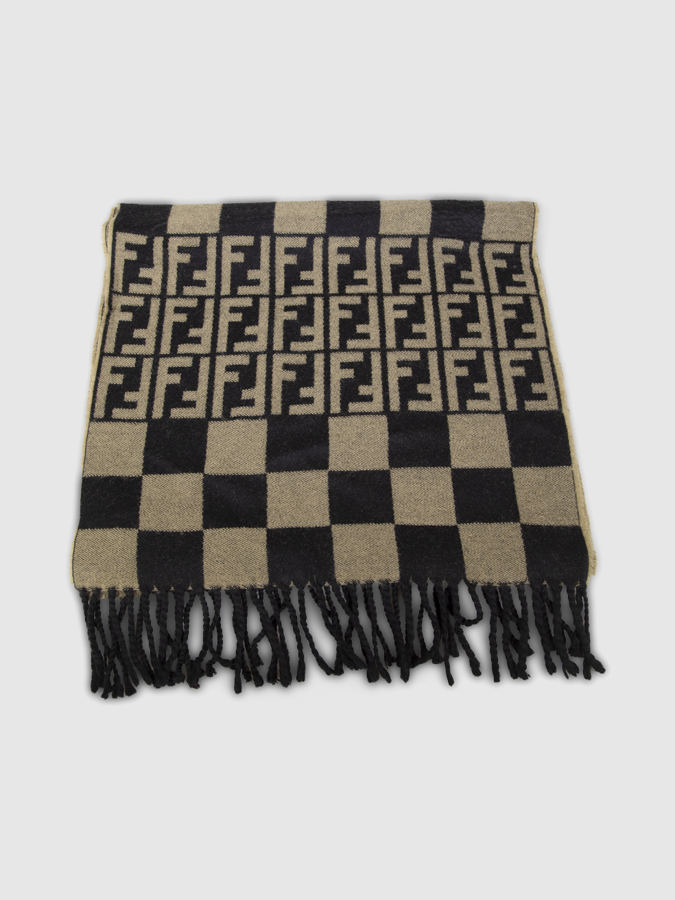 Fendi Beige Wool Zucca Logo Fringed Scarf