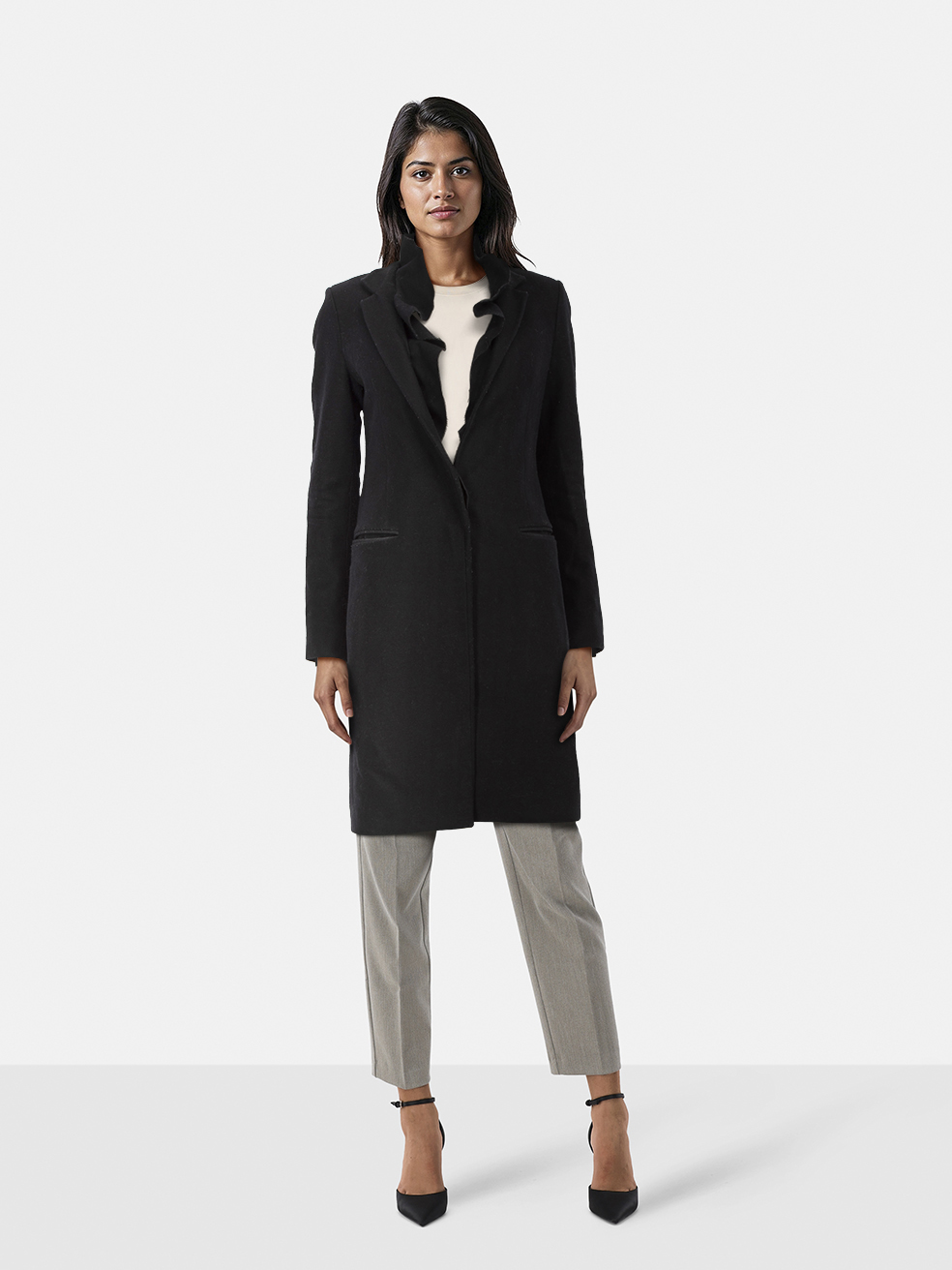 All Saints Black Wool Mae Ruffle Coat