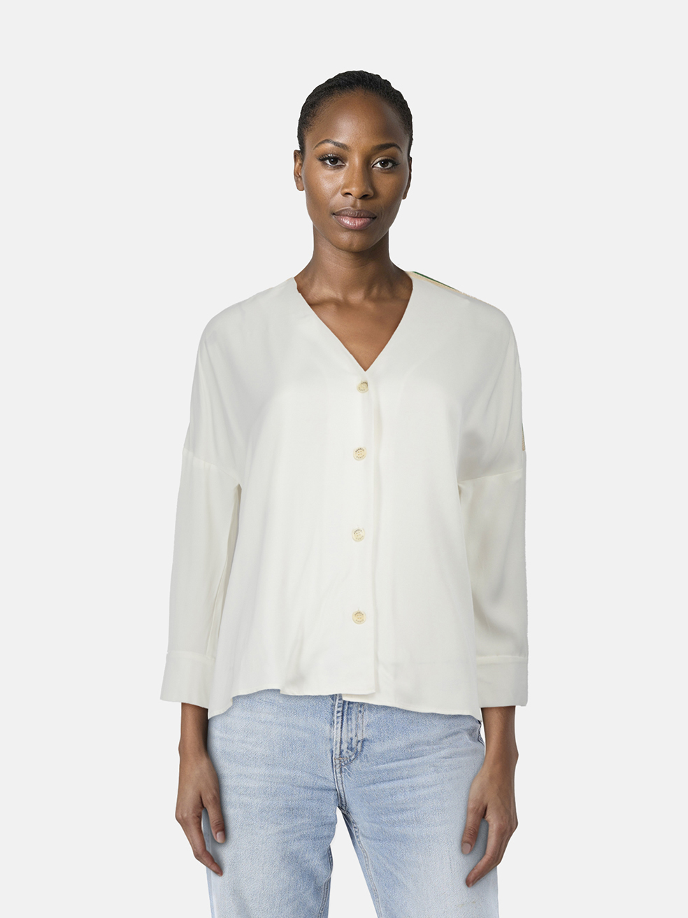Sandro White V-Neck Shoulder Stripe Blouse